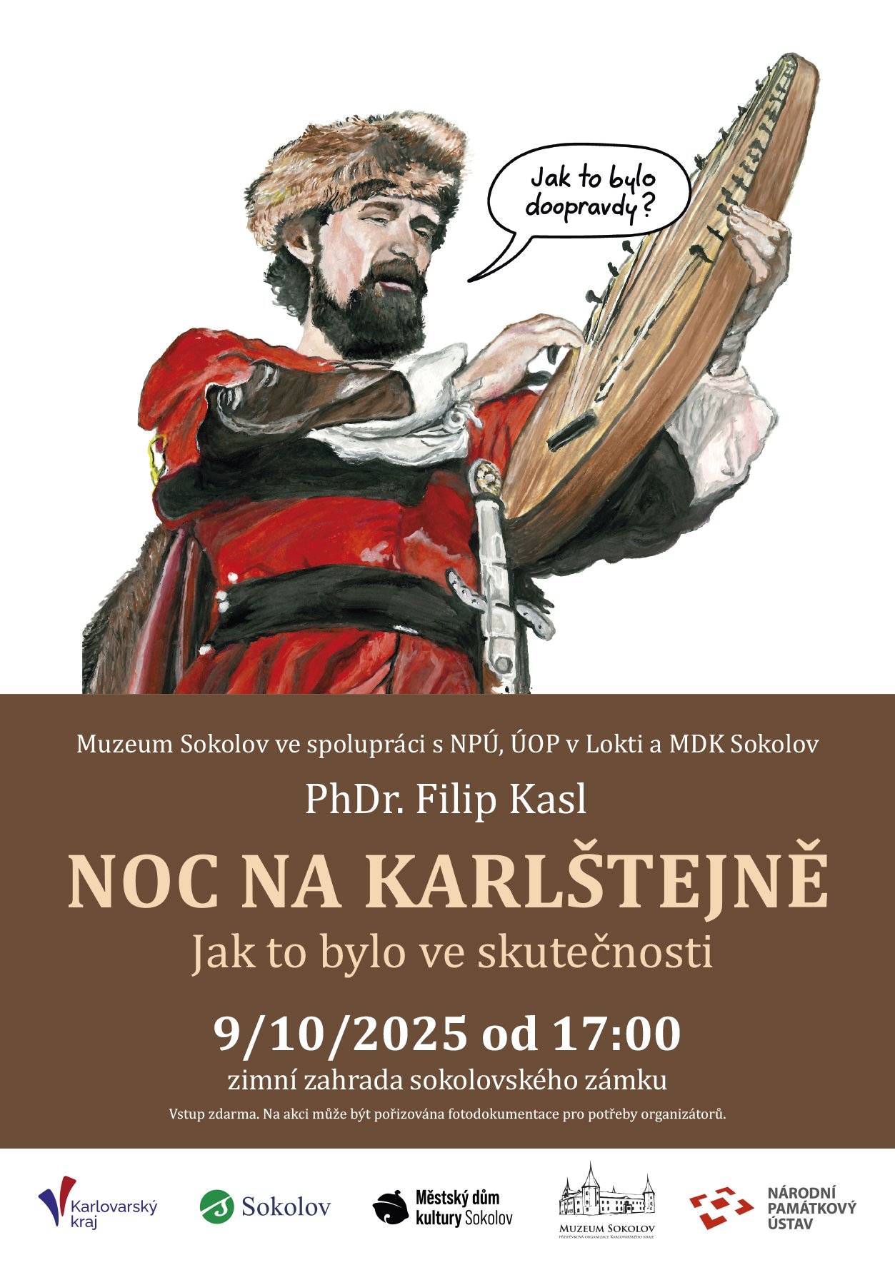 Víte, kdo byl Petr, král Cyperský a proč ve skutečnosti navštívil Karla IV.? Víte, kde se nachází a k čemu původně sloužil hrádek Karlík? Tušíte, co nejvíce zaujme středověkého badatele na filmu Noc na Karlštejně? Odpovědi a mnohé zajímavosti o skutečných postavách, místech a předmětech znázorněných ve slavném muzikálu se dozvíte v populárně naučné přednášce archeologa Filipa Kasla ve čtvrtek 9. října od 17 hodin v zimní zahradě sokolovského zámku. Akce se uskuteční ve spolupráci s NPÚ, ÚOP Loket a MDK Sokolov. Vstup zdarma. Na akci může být pořizována fotodokumentace pro potřeby organizátorů.