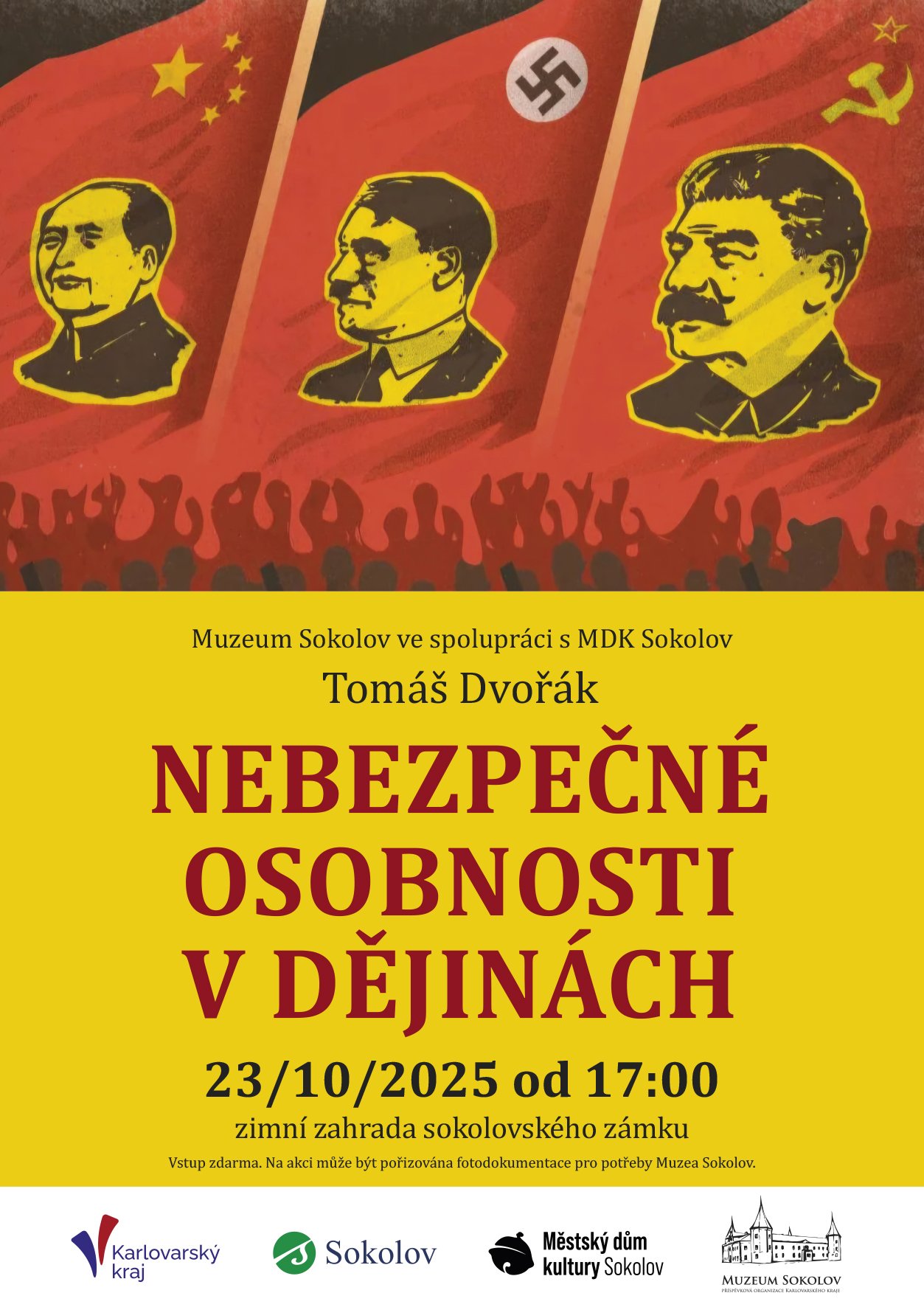 Přednáška představí problematické či přímo nebezpečné postavy nejen našich dějin. Uskuteční se ve čtvrtek 23. října od 17 hodin v zimní zahradě sokolovského zámku. Přednáška proběhne ve spolupráci s MDK Sokolov. Vstup zdarma. Na akci může být pořizována fotodokumentace pro potřeby muzea.