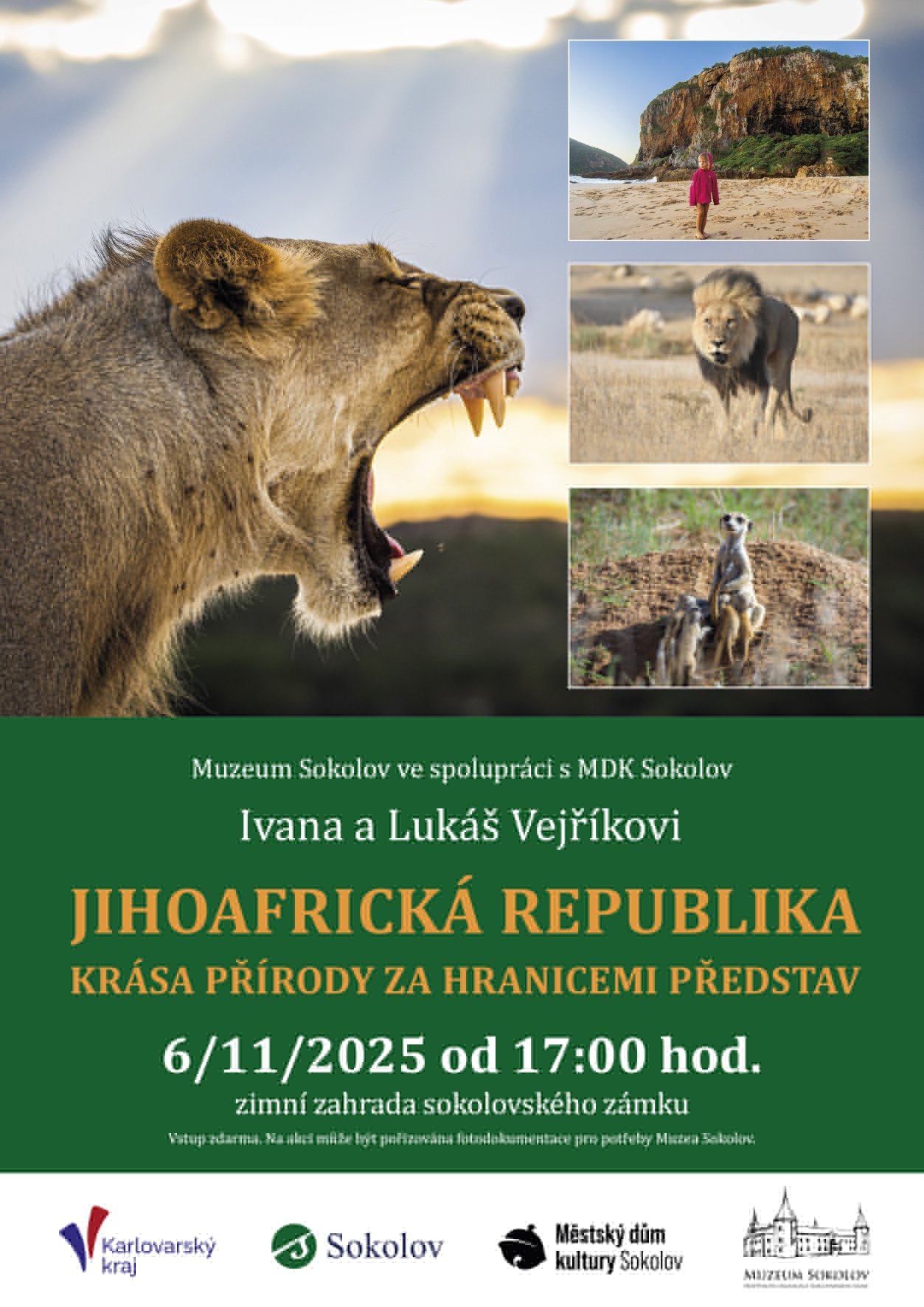 O přírodních krásách Jihoafrické republiky se více dozvíte na přednášce archeologa manželů Vejříkových ve čtvrtek 6. listopadu od 17 hodin v zimní zahradě sokolovského zámku. Akce se uskuteční ve spolupráci s MDK Sokolov. Vstup zdarma. Na akci může být pořizována fotodokumentace pro potřeby Muzea Sokolov.