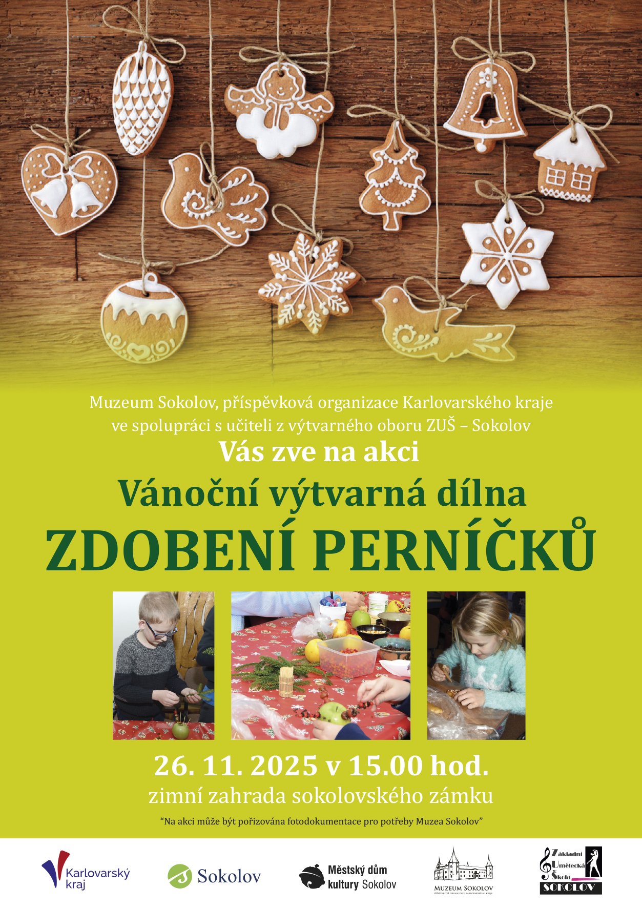 Ve středu 26.11. se od 15 hodin v zimní zahradě sokolovského zámku uskuteční tradiční výtvarná dílna s vánoční tématikou a chybět tak nebude zdobení perníčků či výroba různých dekorací a ozdob. Akce proběhne ve spolupráci se ZUŠ Sokolov. Vstup zdarma. Na akci může být pořizována fotodokumentace pro potřeby Muzea Sokolov.